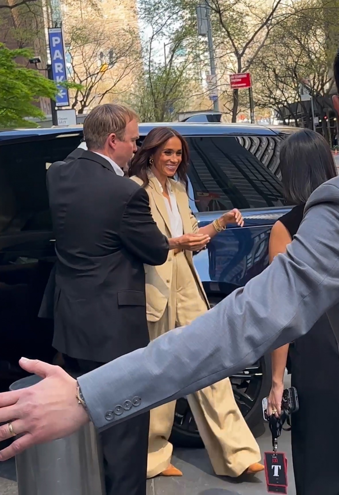 Megan je tako držala ruke jer "ima ljude koji će joj ovoriti vrata i radiiti sve umesto nje". Vojvoptkinja je pomno pratila kamere i inicirala prijatelsjke zagrljaje sa ljudima koji su ih dočekali.