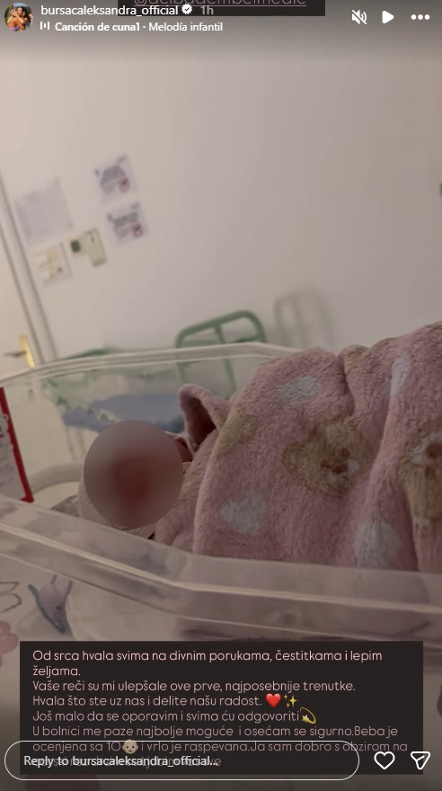 - Од срца хвала свима на лепим порукама, честиткама и лепим жељама. Ваше речи су ми улапшале ове прве најпосебније тренутке. Хвала што сте уз нас и делите нашу радост. Још мало да се опоравим и свима ћу одговорити. У болници ме пазе најбоље могуће и осећам се сигурно. Беба је оцењена са 10 и врло је распевана. Ја сам добро, с обзиром на царски рез - поручила је кратко Александра Бурсаћ.