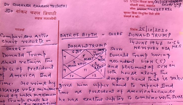 Трипати је направио наталну карту америчког председника и на Твитеру објавио да, када се Трампове звезде упореде са Бајденовим - нема недоумице ко ће победити. Трамп је рођен 14. јуна 1946. године у Њујорку.