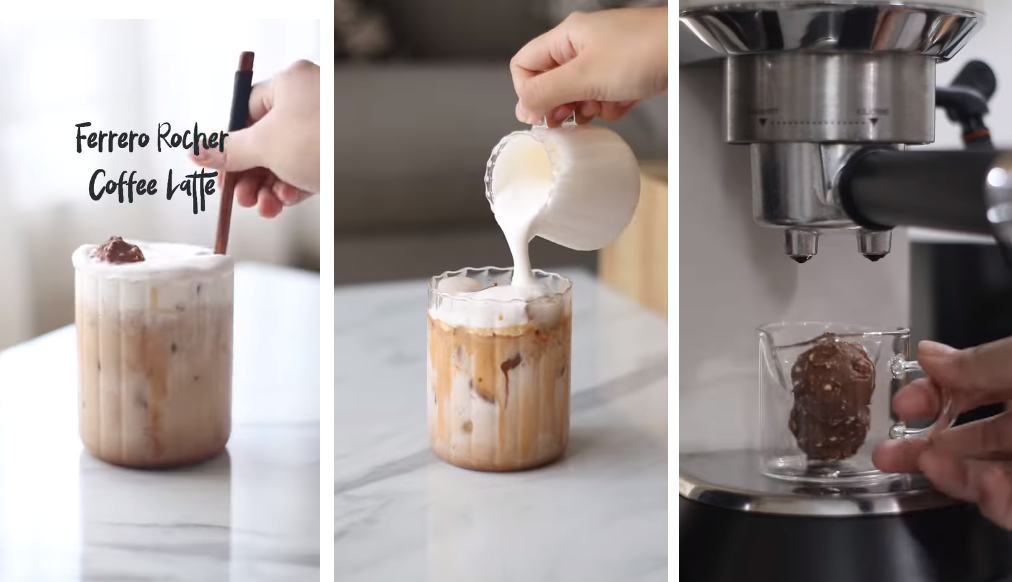 У другу шољицу ставите две куглице чоколадице и ту шољу ставите је у апарат за еспресо кафу и сипајте две дозе кафе преко чоколадица па чекајте да се отопе. Када се отопи, сипајте преко леда и млека у другој шољи.