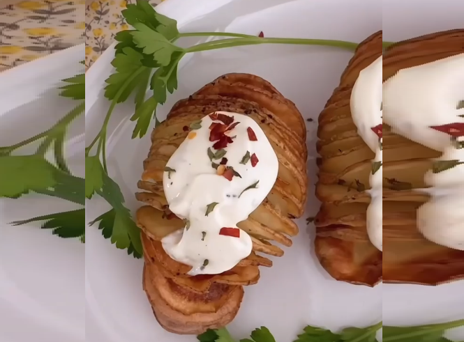 Добро оперите два већа бела кромпира. Након тог поступка, разрежите кромпир са горње стране на танке листиће, али водите рачуна да не преполовите кртолу. Узмите па сваки листић премажите умућеним јајетом па их ставите на папир за печење и убаците у рерну на 200 степени око 30 минута.