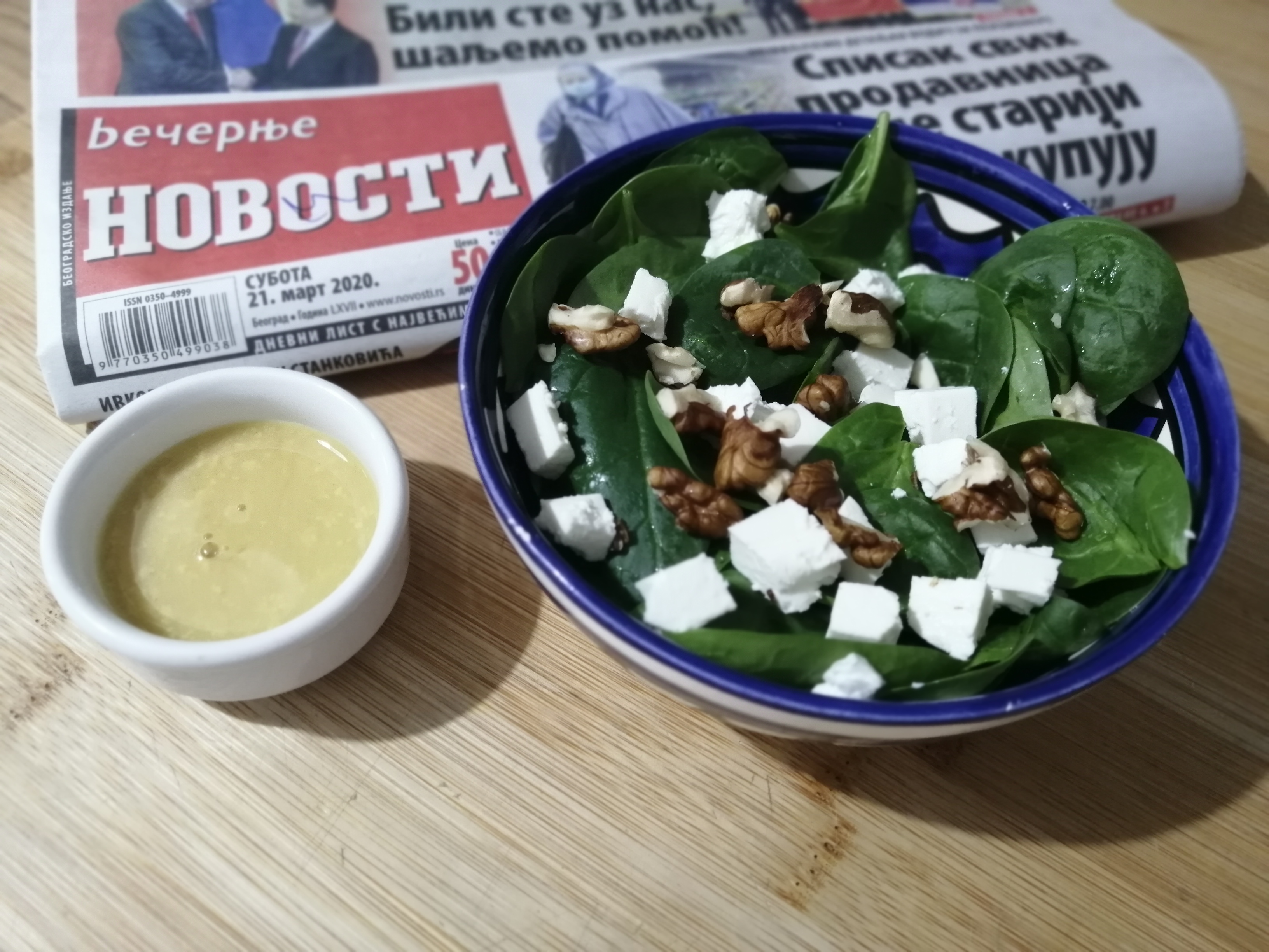 Да би се направила ова салата веома је важно набавити беби-спанаћ, јер је сладак. Старији спанаћ је мало горак и мора да се термички обради да би био укусан. За једну особу довољна је пуна шака спанаћа.