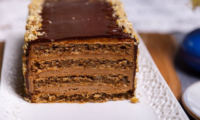 Торту украсите по жељи, језгрима ораха, ренданом чоколадом или поспите млевеним орасима и оставите да преноћи у фрижидеру, па исеците на жељену парчад и послужите.
