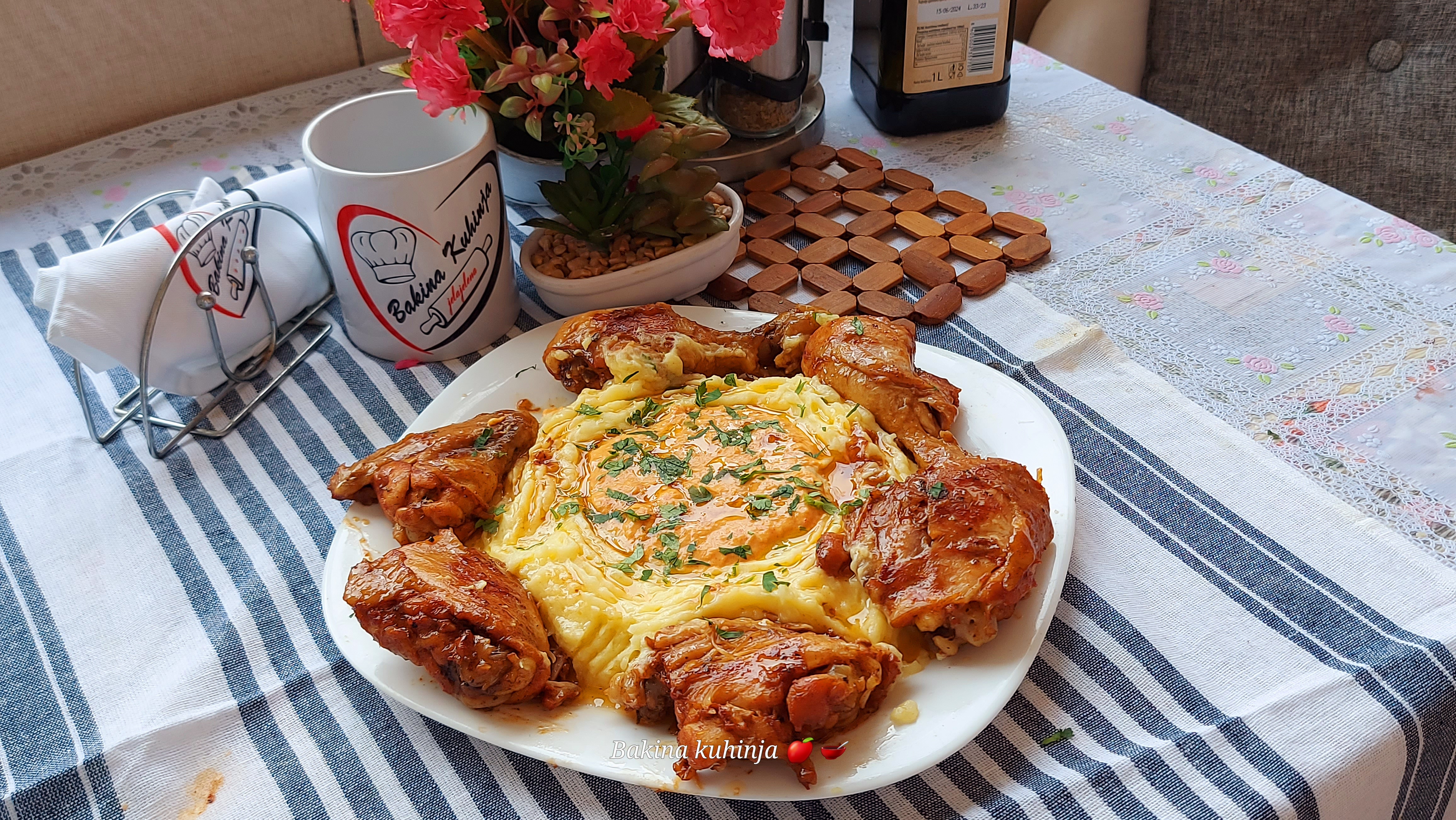 Направите кромпир пире, па га ставите на средину већег тањира и издубите кашиком, па у средуну ставите сос, а около поређајте запечене батаке. Служите уз салату.