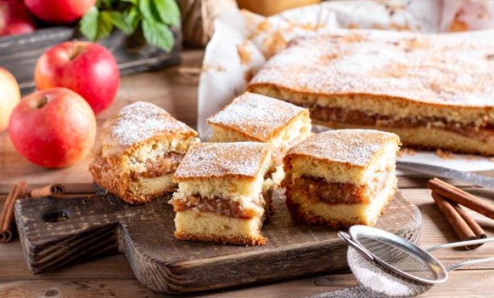 Огулите јабуке и исецкајте их на коцкице. У већој посуди измиксајте маслац, шећер, ванилу и со. Мешајте док не добијете кремасту смесу, а затим додајте јаја и млеко. У другој посуди помешајте пудинг од ваниле, брашно и прашак за пециво, а потом их додајте у припремљену кремасту смесу. На крају у посуду преспите исечену јабуку. Тесто излијте у калуп премазан маслацем, и пеците 45 минута у рерни претходно загрејаној на 180 степени.