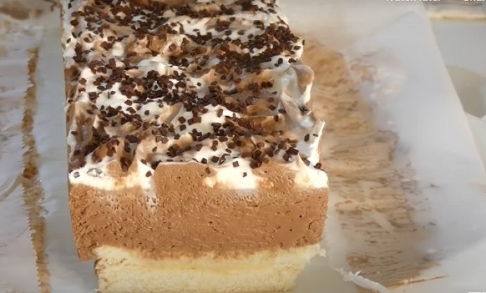 Кору пресећи на два дела или поређати пишкоте у дубљи плех обложен пек папиром. Чоколаду за кување отопити на лаганој температури. Док се топи, кору мало испрскајте водом, млеком или соком (или натопите пишкоте).