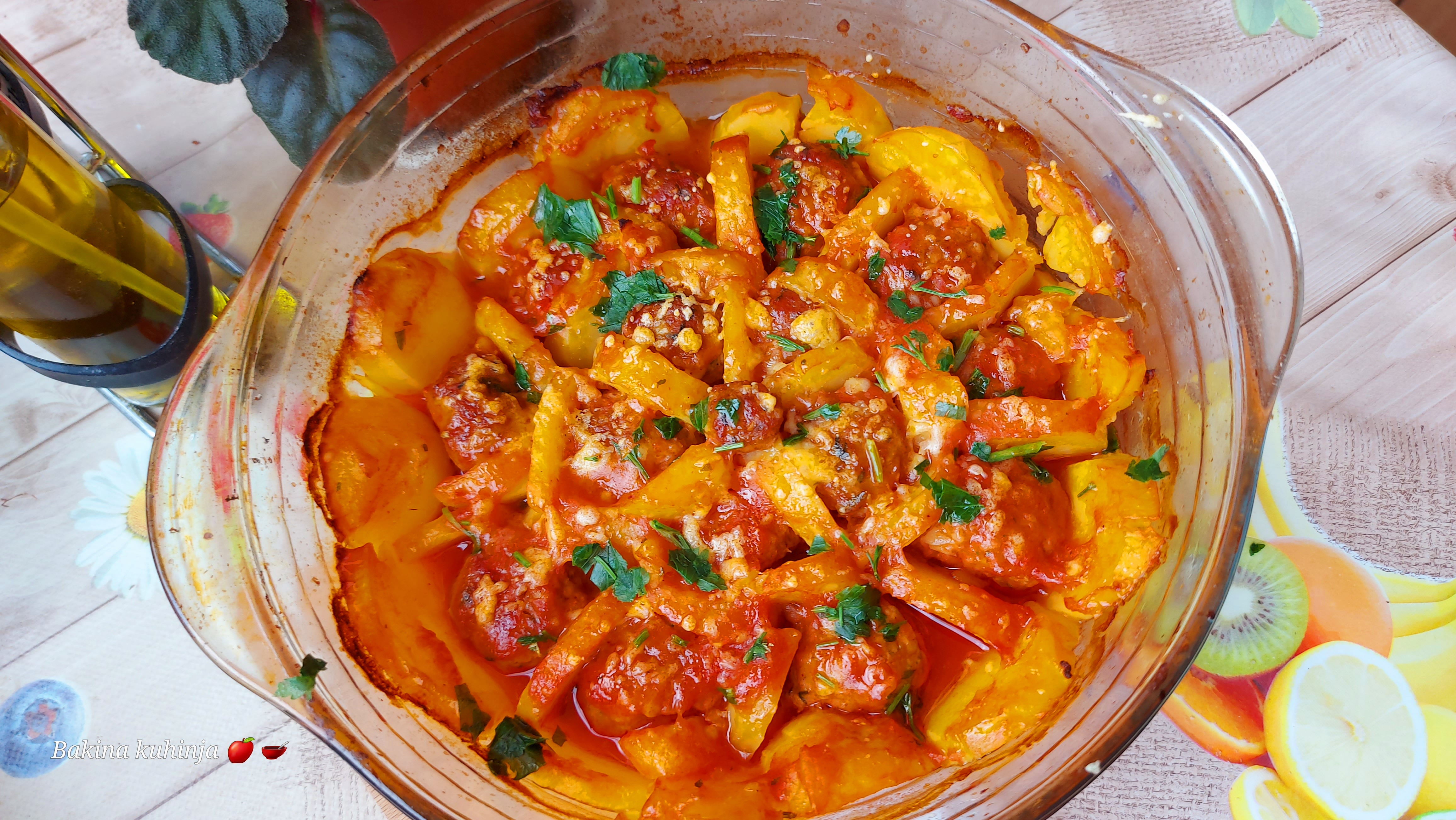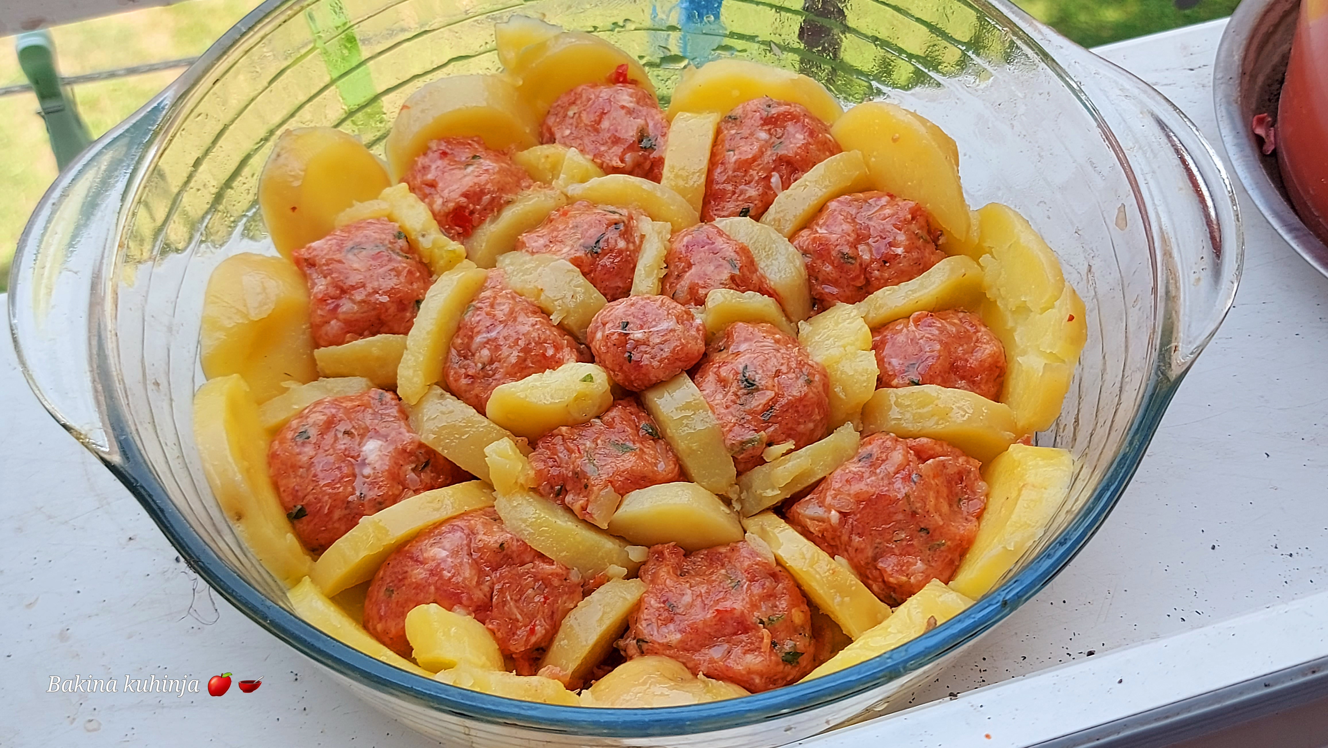Све добро изједначити и правити мале ћуфтице. Кромпир мало обарити са љуском па га очистити и сећи на колутове.