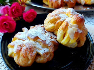 Мало посолити и замесити глатко тесто. Кад тесто мало одмори развући тање и сећи на траке. Јабуке огулити, извадити средину и исећи на округле колутове дебљине прста. Траке прорезати на два дела, па обавијати јабуке провлачећи кроз отвор.