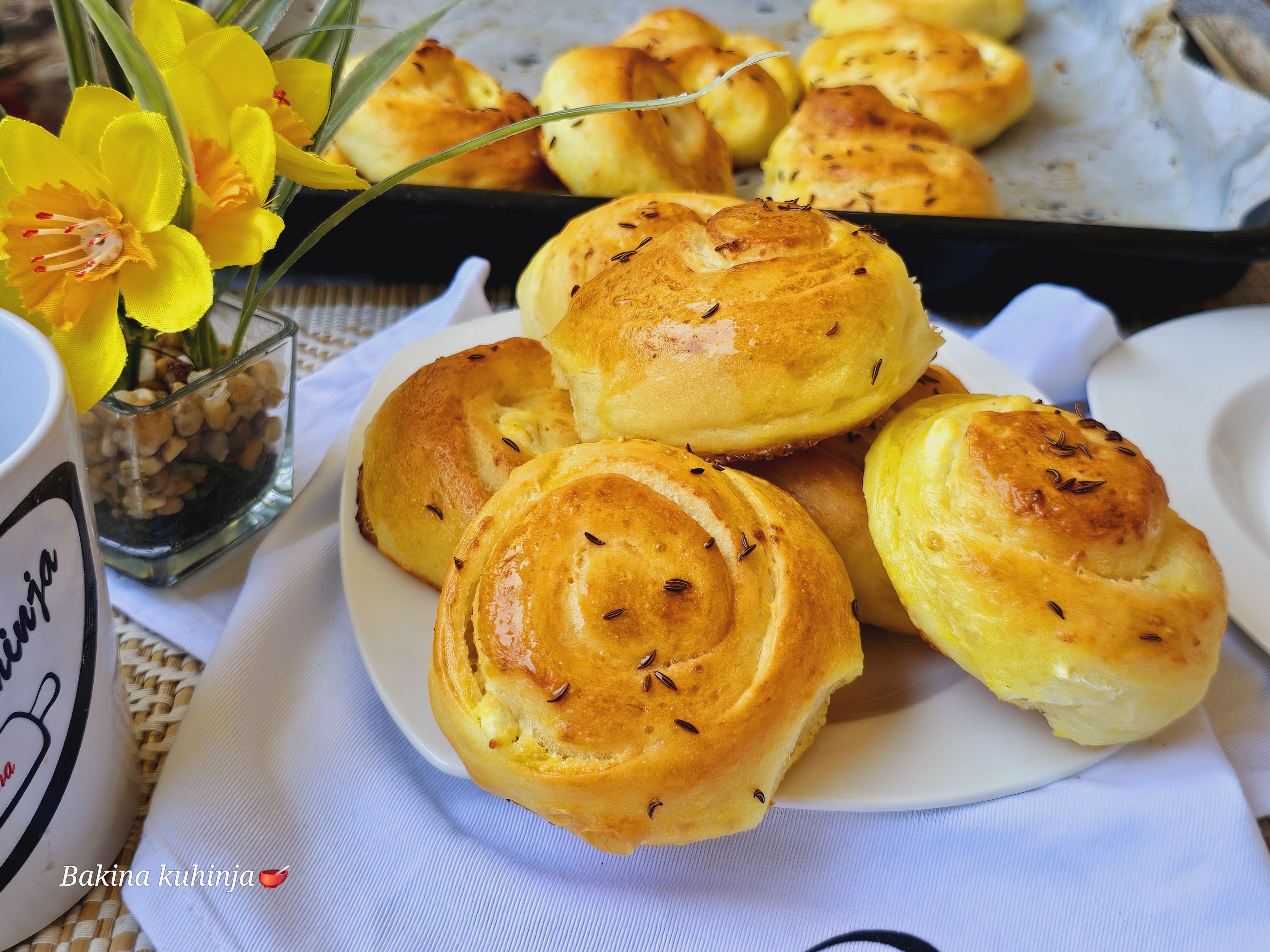 Сећи на два прста дебљине, мало развући, па увити, Ређати у подмазан плех. Оставити да мало порасте, премазати жуманцетом и пећи на 210 степени Ц 30 минута.