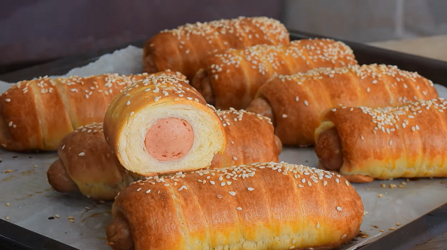 Затим развити кору и исећи је на 12 тракица. По једну виршлу замотати у сваку тракицу. Уролане виршле ставити у подмазан плех, и након десетак минута их премазати умућеним јајетом и посути сусам, па пећи око 20-25 минута на 200 степени.