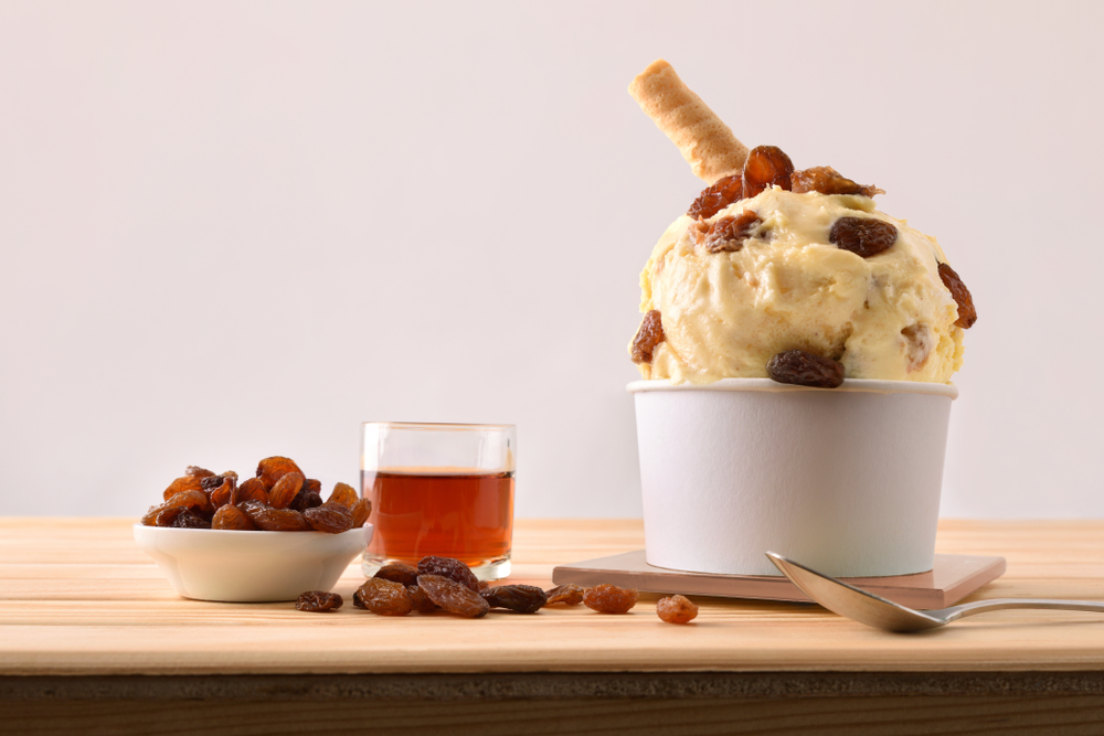 Одвојите жуманца од беланаца. Умутите беланца и додајте шећер у праху. У другој посуди умутите шлаг и додајте, једно по једно, жуманце и суво грожђе. Спојите обе смесе, лагано промешајте и сладолед је готов. Ставите у замрзивач и сачекајте да се добро охлади и стегне. По жељи можете да додате рендану чоколаду или какао.