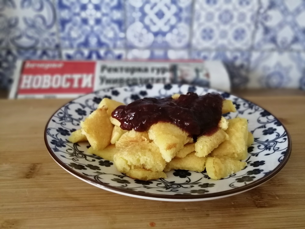 Мрвице поспите циметом и према жељи кристал шећером. Одозго прелијте пекмезом од шљива.