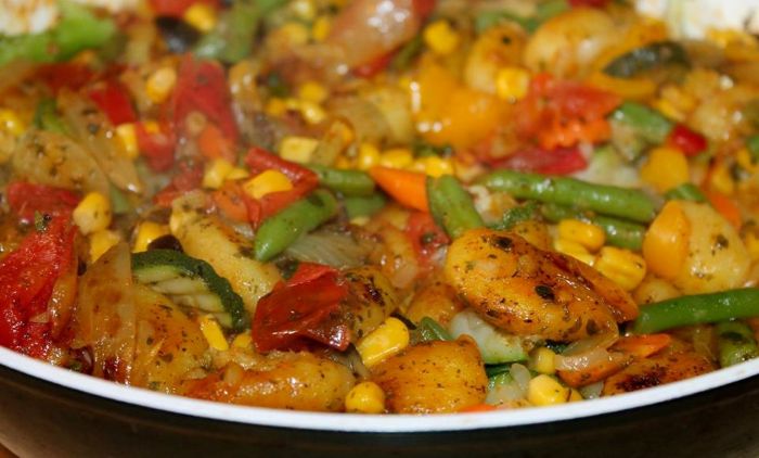 Пилећи филе исецкајте на коцкице и пржите на маслацу десетак минута. Потом у тој масноћи пропржите поврће: лук, паприку, парадајз, шаргарепу, док ћете у мањој шерпи ставити да се кува кромпир, кукуруз, боранија и пиринач око 20 минута.