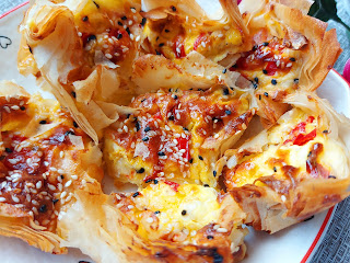 Издробити сир додати јаја и прашак за пециво и изједначити. Пет кора премазати уљем исећи на 4 коцке, па па на 8 коцки. Издвојити 5 сечених корица преклопи мало ћошкорве (уштинути) па пробости чачкалицу. Ређати у подмазан плех. У сваку корпицу убацити кашику сира па све премазати уљем ивице па повадити чачкалице.