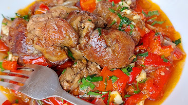 Џигерицу у тигању мало препећи на уљу, пар минута. Убацити на ребарца црни лук, па га пржити да омекне па додати исечену печену паприку и пржити 10 минута.