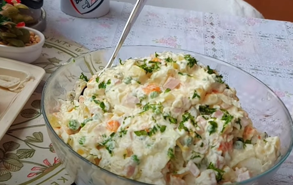 Купус нарендати, па посолити и мало рукама изгњечити и оставити 10 минута. Додати кромпир, шаргарепу, јаја, шунку, краставчиће - све исецкане на коцкице.