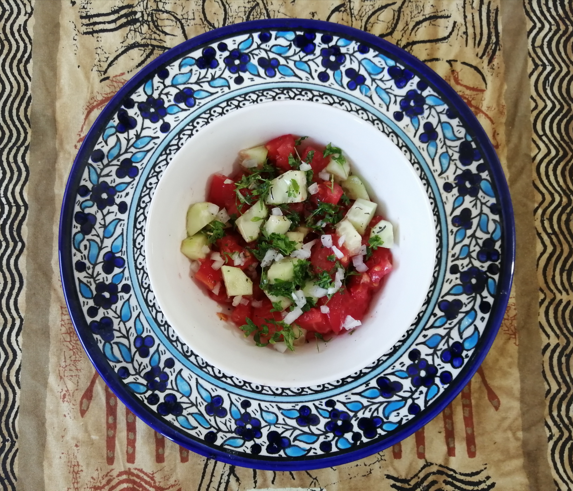 Ова количина поврћа је довољна за једну особу. Парадајт, краставац и паприка се исеку на коцкице, па се помешају. Мали црвени лук се исецка ситно, а довољно је искористити и само половину. Преко салате се исцеди лимун и све добро помеша. Салата се посоли и побибери, па се зачини кумином и маслиновим уљем.