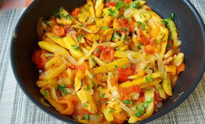Исећи лук на танке резанце, а паприку на тање кругове. Лук пропржити на уљу, додати зачин, па кад мало омекне убацити паприку.