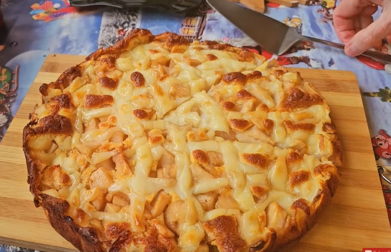 Плех округли већи, од 30 цм, обложити пек папиром. Сипати тесто, па разбацати пржене јабуке.