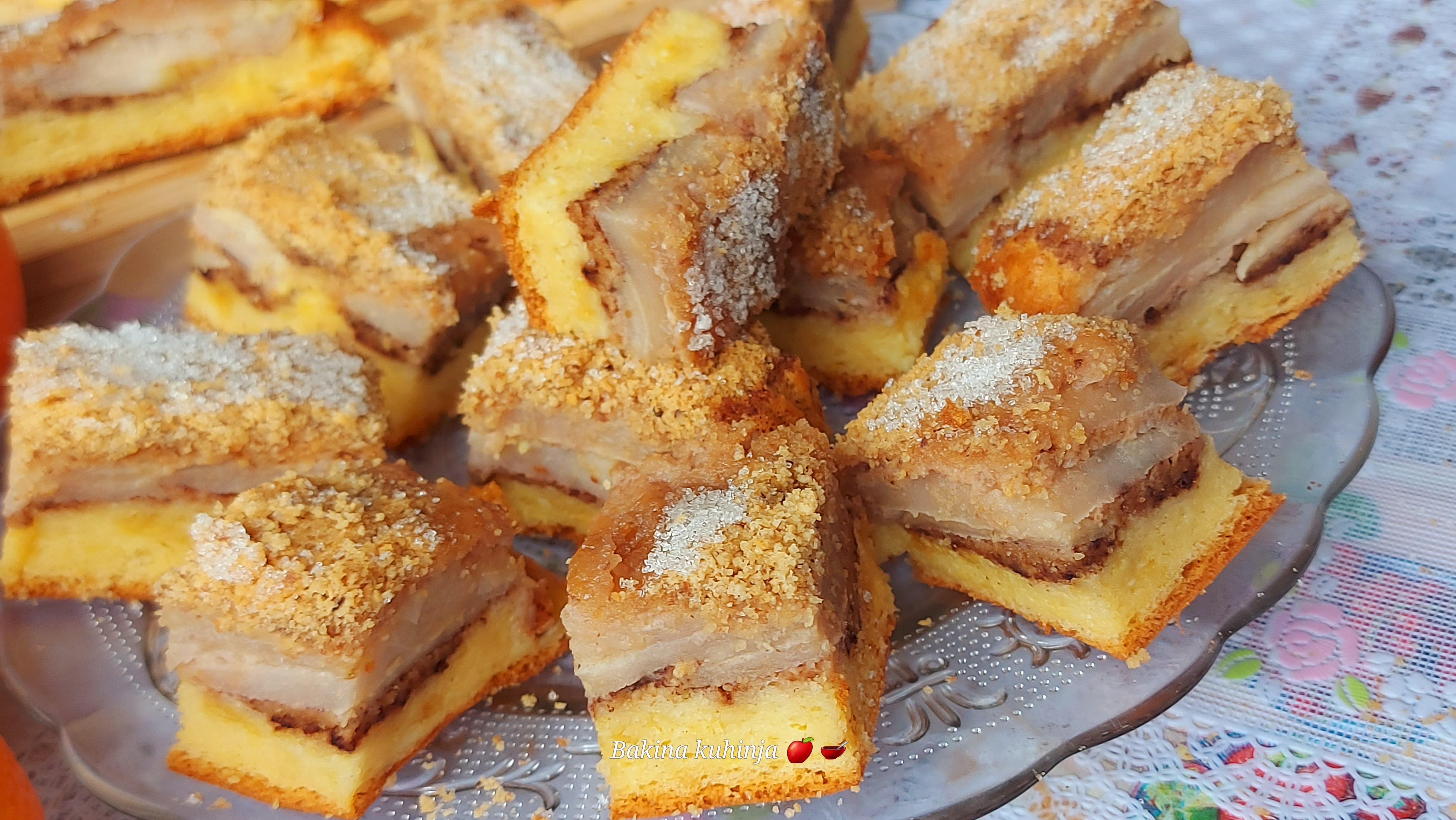 Плех подмазати уљем, па мало на дно посути млевене орахе и кекс, па поређати јабуке сечене на листиће, а онда посути цимет.