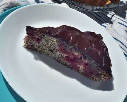 Горе ставите око 400 гр. вишања и малина. Пеците колач око 25, 30 минута у загрејаној рерни на 180°. Истопите 150 гр. црне чоколаде, са 5 кашика воде и једном кашиком уља. Прохлађен колач избоцкајте на пар места па прелите истопљеном чоколадом. Пријатно!