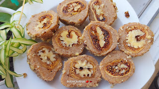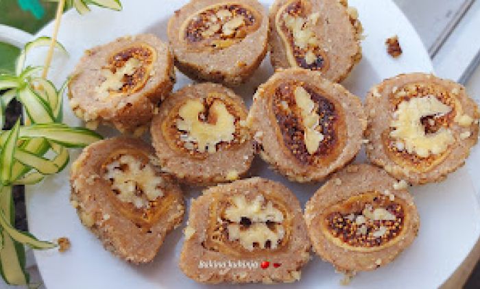 Узети једну кашику измешаног кекса, па у средину убацити смокву са језгром ораха. Обликовати лоптицу у рукама и уваљати у сецкане или млевене орахе.