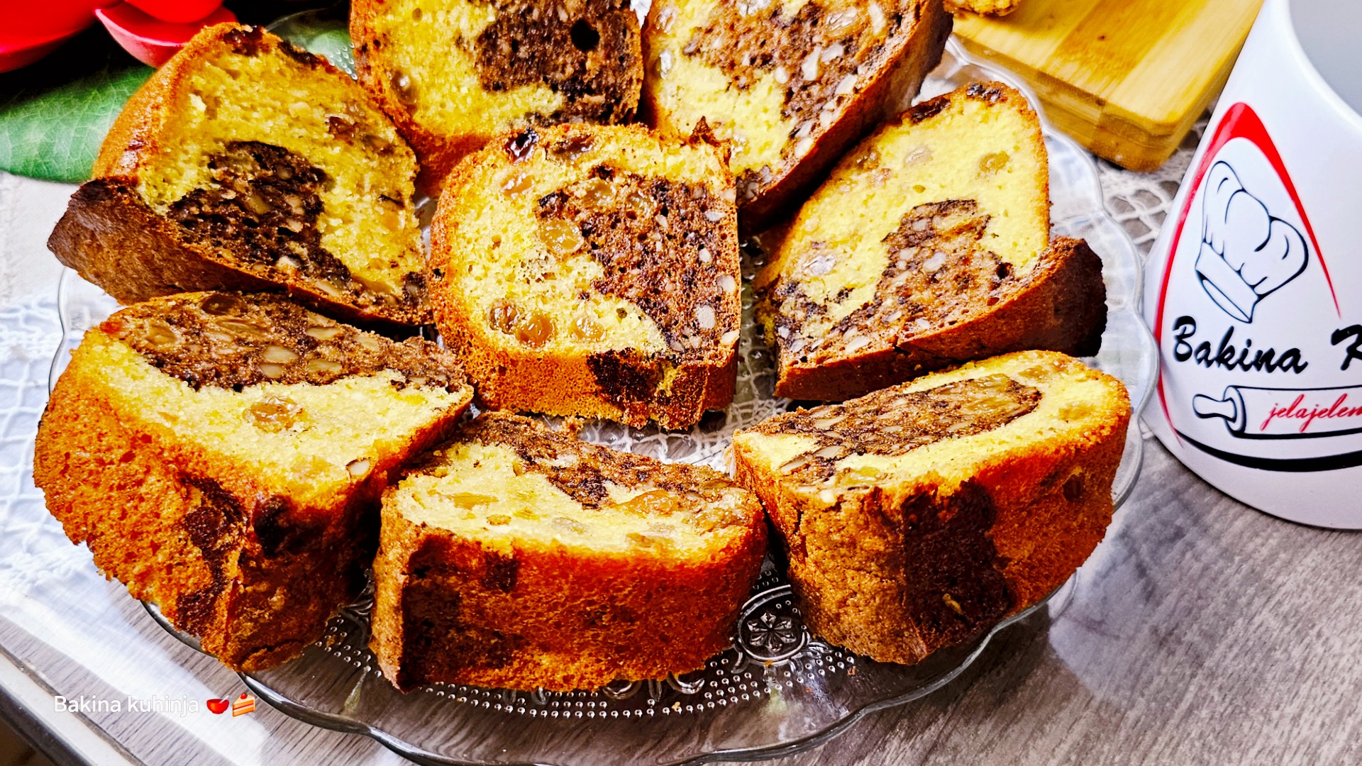 Умутити јаја са шећером, додати брашно са прашком за пециво просејано. Убацити уље, суво грожђе које сте потопили у воду, корицу лимуна и 2 ванилин шећера. Све изједначити.