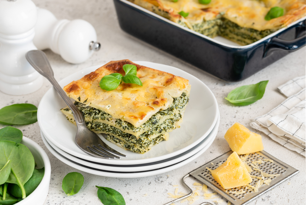 На отопљеном путеру пропржите брашно, и уливајте топло млеко мешајући жицом, док не добијете глатку масу. Кад почне да кључа, склоните са ватре. У врућ сос умешајте крем-сир, посолите, побиберите и нарендајте мускатни орашчић. У плех намазан путером ређајте ред лазања, ред спанаћа, послите и побиберите, па ставите ред бешамел соса и ред ренданог качкаваља. Јело завршите слојем од лазања, бешамела, па ренданог качкаваља. Треба да буду укупно четири слоја. Пеците у загрејаној рерни на 200 степени, око 25 минута.