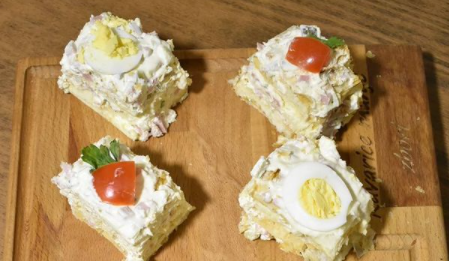 Сиру додате кајмак, мајонез, исецкана јаја, исецкану шункарицу, исецкан краставац, све измешајте, посолите,