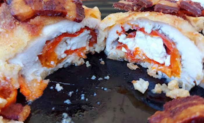 Месо исећи на тање комаде па их излушати између фолије, Посолити, побиберити и додати белог лиука и першуновог листа. Сваки филет премазати сирним намазом па додати листове паприка. Преко ставити сир фета и увити у ролат. ролнице провући кроз брашно умућена јаја и презле. Ређати у подмазан плех па одозго ставити листове сланине. Пећи на 220 степени Ц око 40 минута