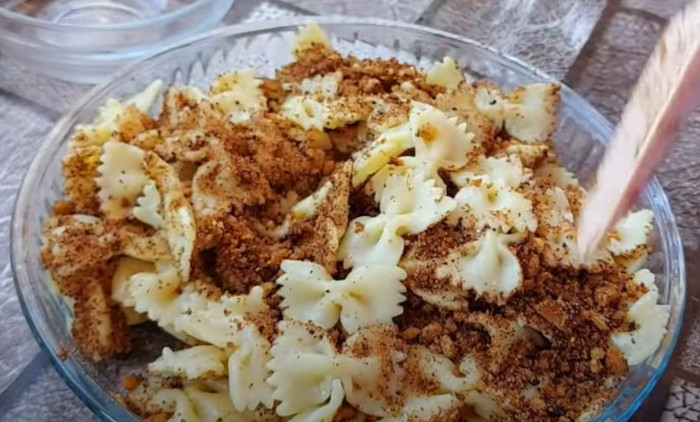 Скувати макароне, па их процедити. На уљу истопити шечер, додати презле и уље и пржити презле да добију крем боју.