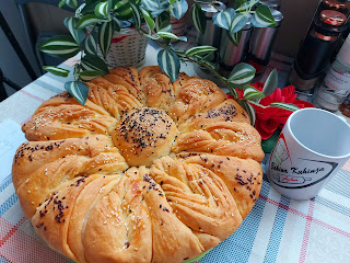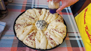 Ређати између претходних троуглова у плеху. У средину ставити шесту малу лоптицу. Покрити да порасте погача, премазати маслиновим уљем и посути семенкама и пећи на 180 степени 40 минута..