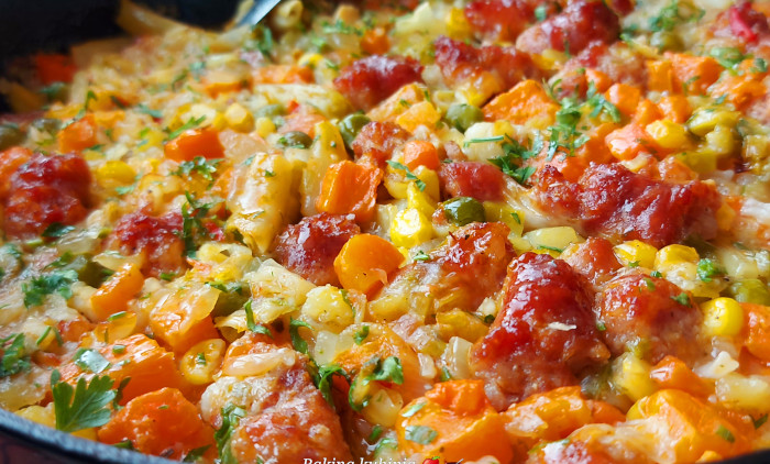 У шерпу која може ићи и у рерну сипати уље па пропржити сечене кобасице. Додати насечен празилук, па кад се мало издинста додати сецкано поврће које имате.