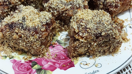 Посути сецканим орасим и печи на 190 степени око 40-50 мин. Охлађен колач премазати џемом и посути мало још мл. орасима. Исећи на крупније коцке и сваки још провући кроз млевене орахе.