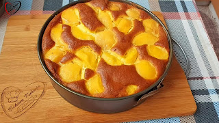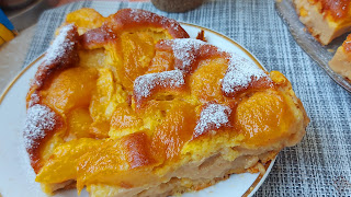 На печен бисквит сипати пола пудинга, а одозго густо насећи кришке ољуштених брескви. Сипати други део пудинга, па преко сипати други део теста. Поређати по тесту остатак брескви сечених. Пећи на 200 степени 1 сат. Пред крај мало покрити фолијом.