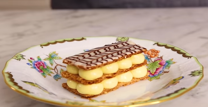 Састојци: 200 г лиснатог теста, шећер у праху, 600 мл млека, штапић ваниле или екстракт ваниле, 3 јаја, 60 г густина, 150 г класичног шећера, 100 г чоколаде за кување за глазуру.