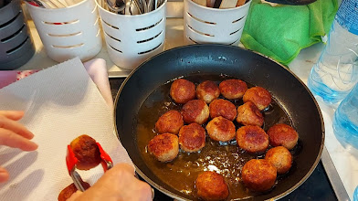 Пржити поклопљене и повремено окретати бар 30 минута. Извадити на упијајућу салвету, Уље процедити, па у половину уља додати брашно, па га пржити да добије крем свелу боју, сипати парадајз и воду и мешати.