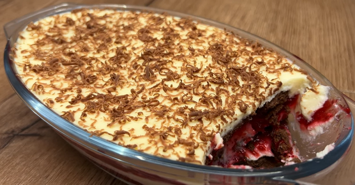 - Преко њих додајте бели фил, па фил од малина, па онда опет поређајте кекс претходно умочен у поморанџу. Ређајте док не утрошите сав материјал. а последњи слој треба да буде фил. Поспите ренданом чоколадом, па ставите у фрижидер да се стегне.
