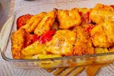 Тепсију обложити пек папиром па поеђати коцкице шунке а преко пола коцкица хлеба