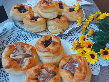 Спајати по две и маказама исећи средину као у видеу и у средину ставити кажичицу џема или еурокрема. Мало нека се одморе, па их премазати жуманцетом и пећи на 190 степени Ц око 30-35 мин.