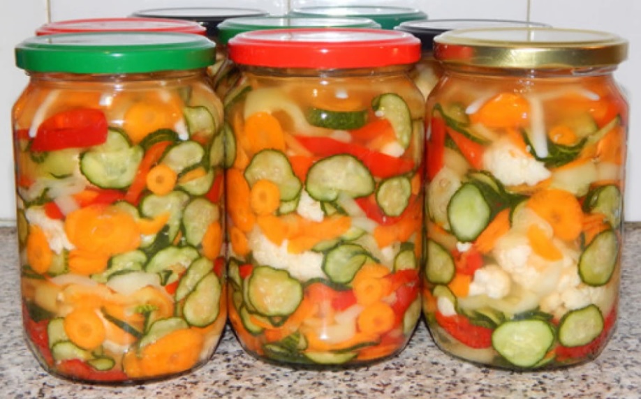 Оставите поклопљено 1 дан, за то време повремено мешајте руком и пуните тегле тако што ћете захватити поврће соком и када се тегла не напуни притиснути да поврће пусти сок (имам малу кутлачу и пуним га и притисните) и када напуните теглу и течност прекрије поврће, ставите пластичне шипке да притиснете поврће и затворите тегле.