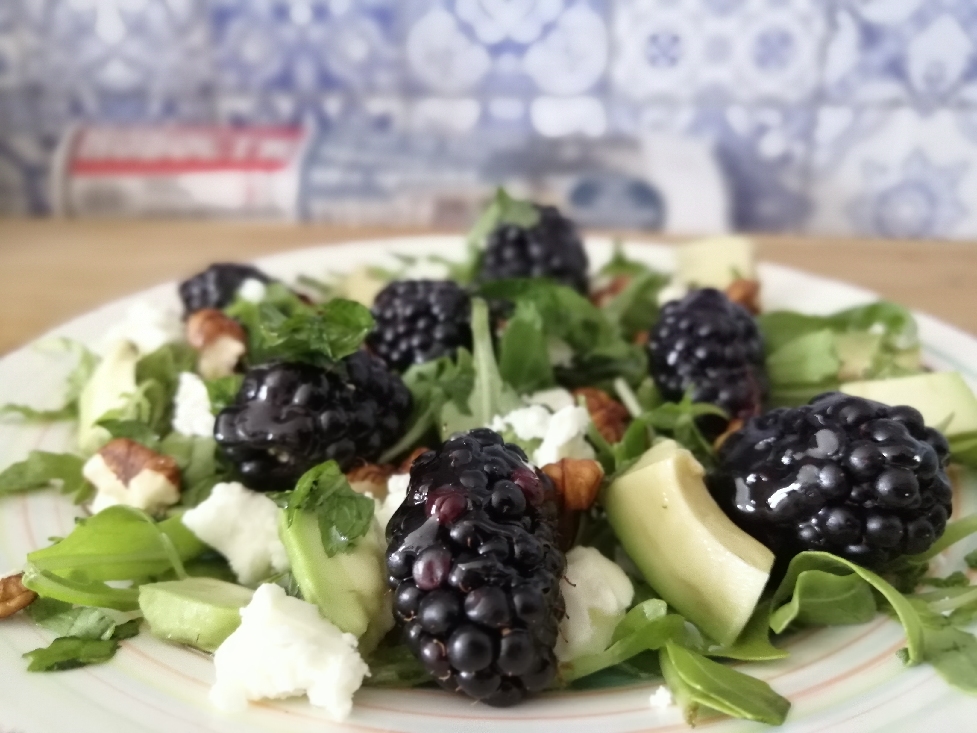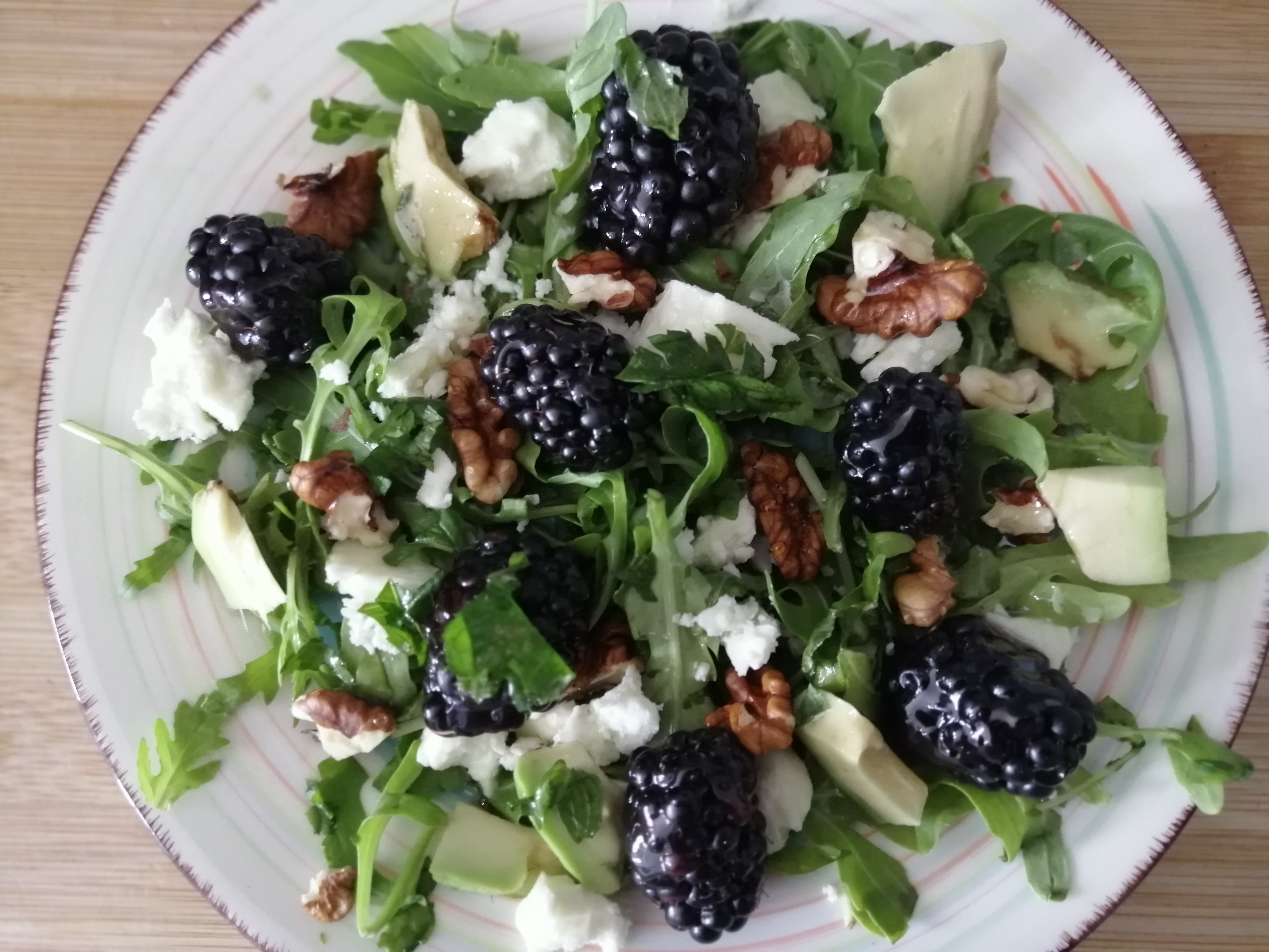 Салата се припрема једноставно, а за почетак се опере рукола, оцеди и распореди по тањиру. Купине се, такође, оперу и поређају по руколи. Козји сир се прстима измрви.