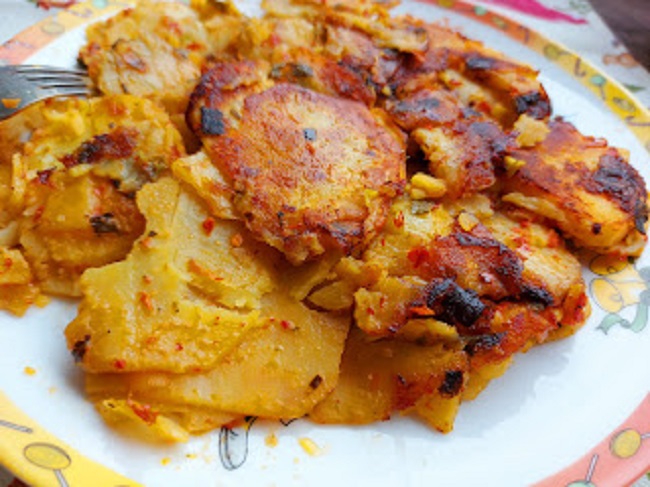 - Кромпир очистити и исећи на листиће. Додамо уље соли, мало зачине бибер,бели лук,ајвар,сецкан млади лук туцане паприке све измешати.