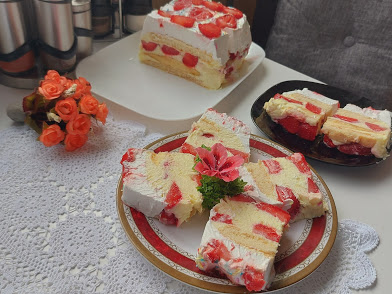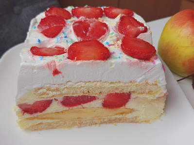 Опет премазати кремом и ставити банане пресечене на пола по дужини, одозго намазати крем, па три ставити пишкоте, а између јагоде. Прекрити фолијом и оставити 2-3 сата у фрижидеру.
