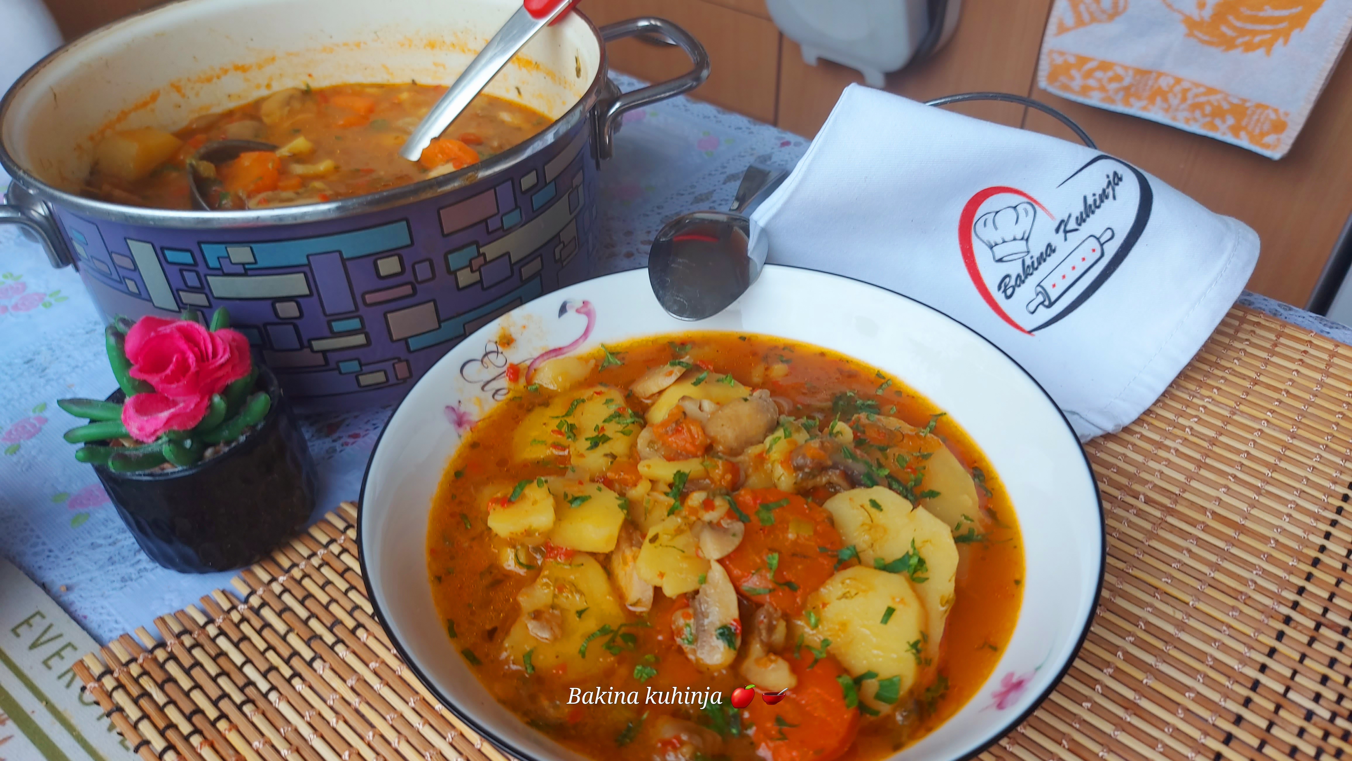 Додати мало алеве паприке, ловоров лист, бибер, оригано и суви зачин. Сипати воде да кува 50 минута. Ако има доста течности, додати кашику умућеног брашна.