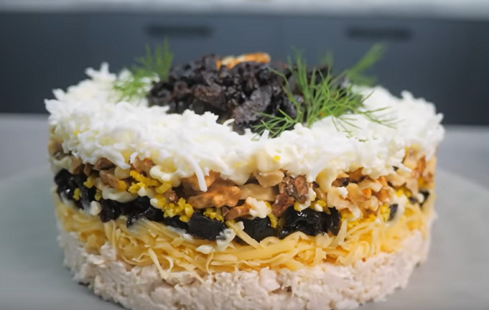 - Пилетину исеците на коцкице и убаците у чинију, па преко пилетине ставите рендани сир, мало мајонеза и исецкане шљиве.