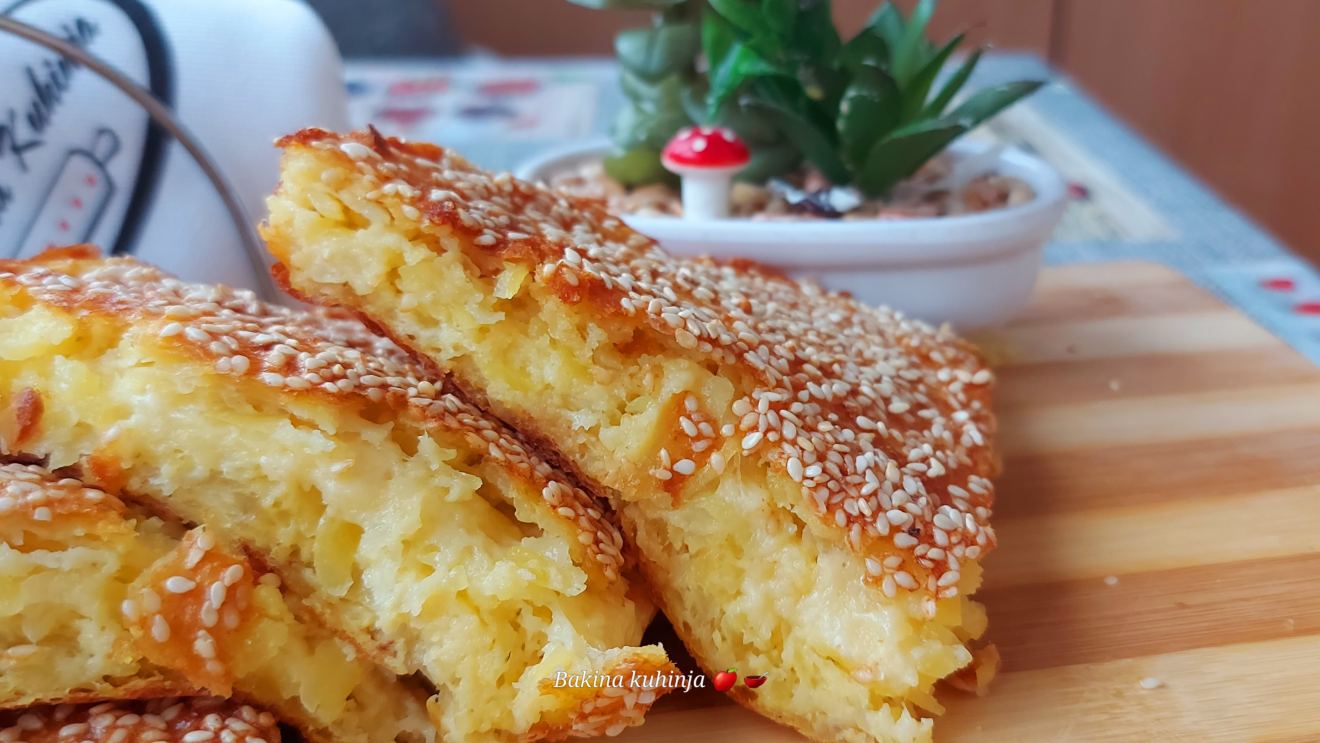 Сипати у плех пола кромпира, па распоредити рендан качкаваљ изравнати и додати други део кромпира. Посути обилно сусамом. Пећи на 200 степени Ц око 45-50 минута да добро порумени.