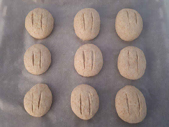 3. Од сваког дела рукама обликујте лоптице, затим мало притисните од горе и прстима мало притисните са стране, да добијете овакав облик. Од горе баш оштрим ножем, направите 2 реза. Оставите их да одстоје 15 - 20 минута, по жељи поспите сусамом, ланом... и пеците у загрејаној рерни на 250 степени око 20 минута у зависности од рерне. Пријатно!