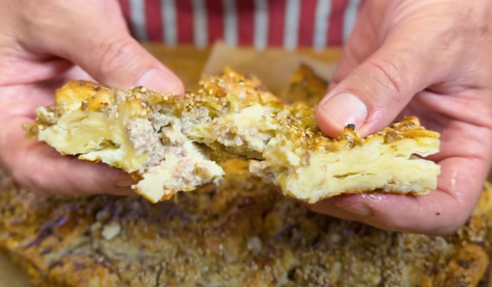 У чинији умутите јаја, уље, сир, грчки јогурт и павлаку и све лепо сједините. Коре исцепкајте на ситне комаде, затим их убаците у чинију са мокрим састојцима и добро промешајте. На крају у ту исту чинију додајте фил од празилука и млевеног меса.
