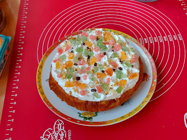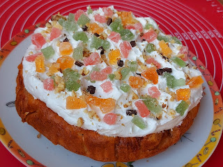 Прелити умућеним тестом. Пећи на 200 степени Ц око 40-45 минута. Украсити умућеним шлагом или посути прах шећером.